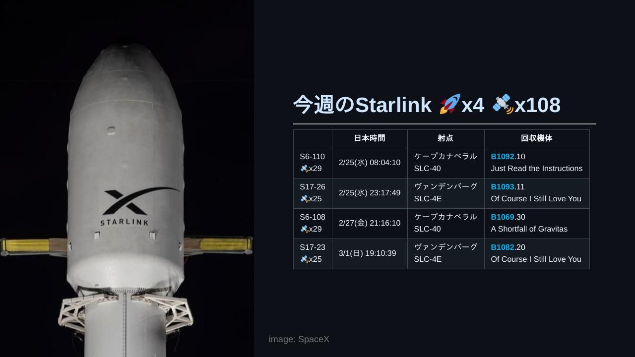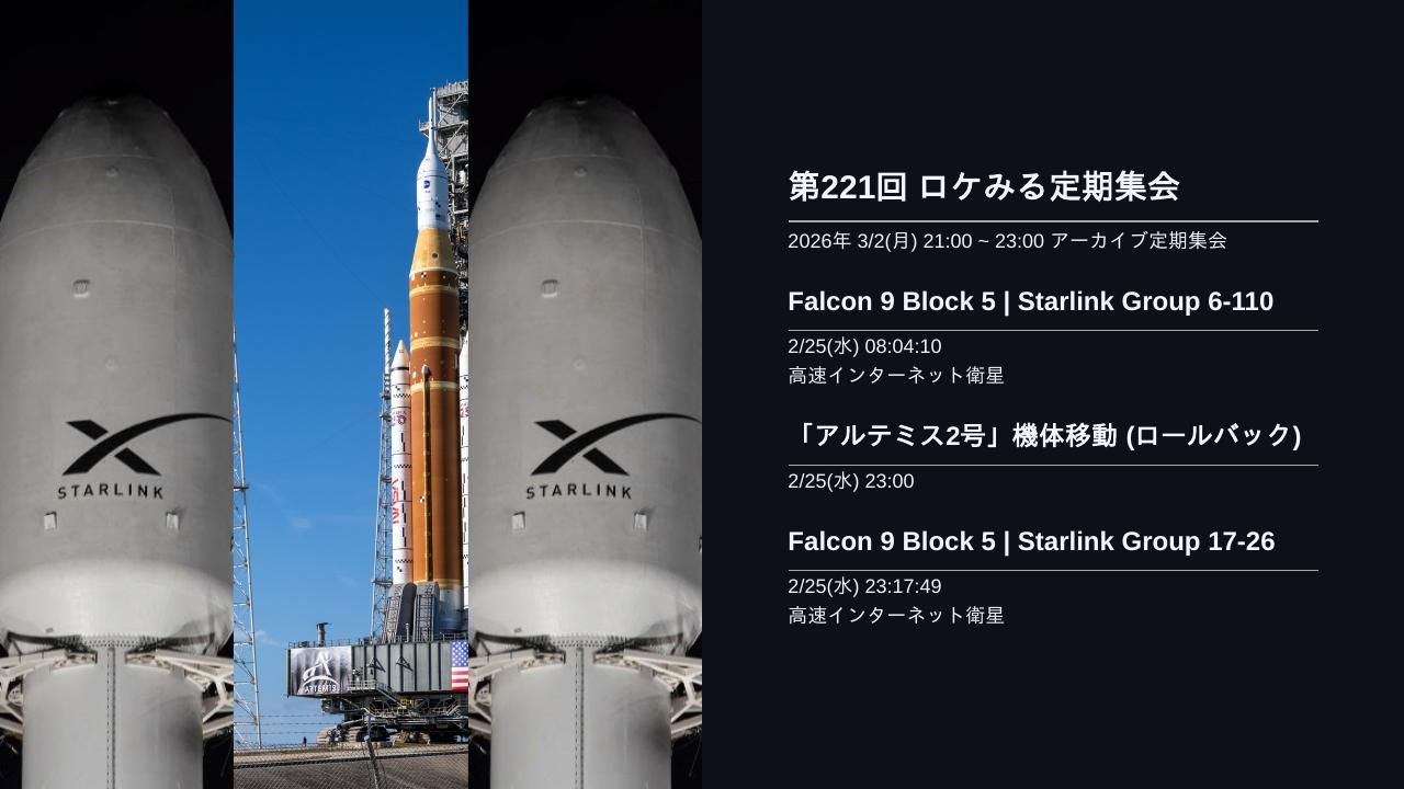 | ミッション | 日本時間 2/25(水) 08:04:10 Falcon 9 Block 5 | Starlink Group 6-110日本時間 2/25(水) 23:00 「アルテミス2号」機体移動 (ロールバック)日本時間 2/25(水) 23:17:49 Falcon 9 Block 5 | Starlink Group 17-26日本時間 2/27(金) 02:05 無人輸送機「SpaceX CRS-33 Dragon」ドッキング解除日本時間 2/27(金) 21:16:10 Falcon 9 Block 5 | Starlink Group 6-108日本時間 2/28(土) 00:00 Artemis II Update News Conference日本時間 2/28(土) 09:00 Electron | That's Not A Knife (DART AE)日本時間 3/1(日) 19:10:39 Falcon 9 Block 5 | Starlink Group 17-23日本時間 3/2(月) 11:56:40 Falcon 9 Block 5 | Starlink Group 10-41 |