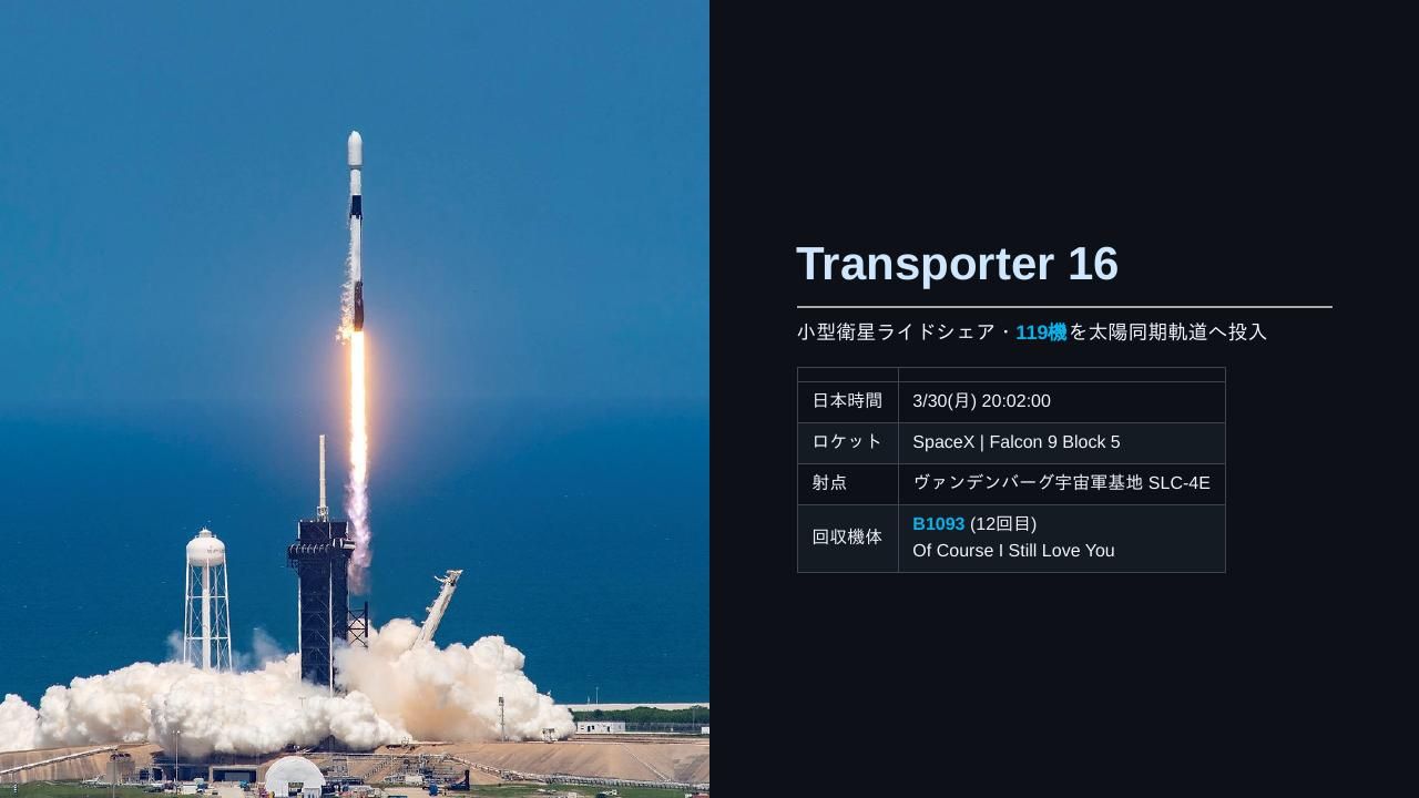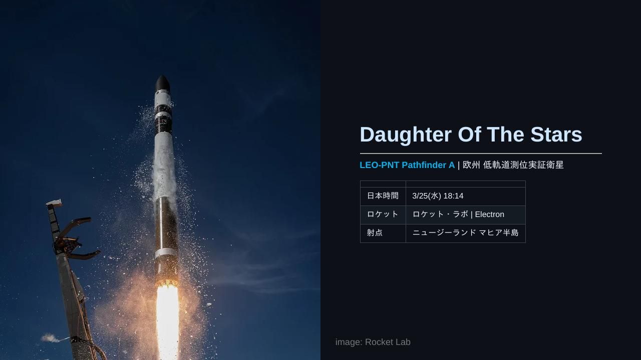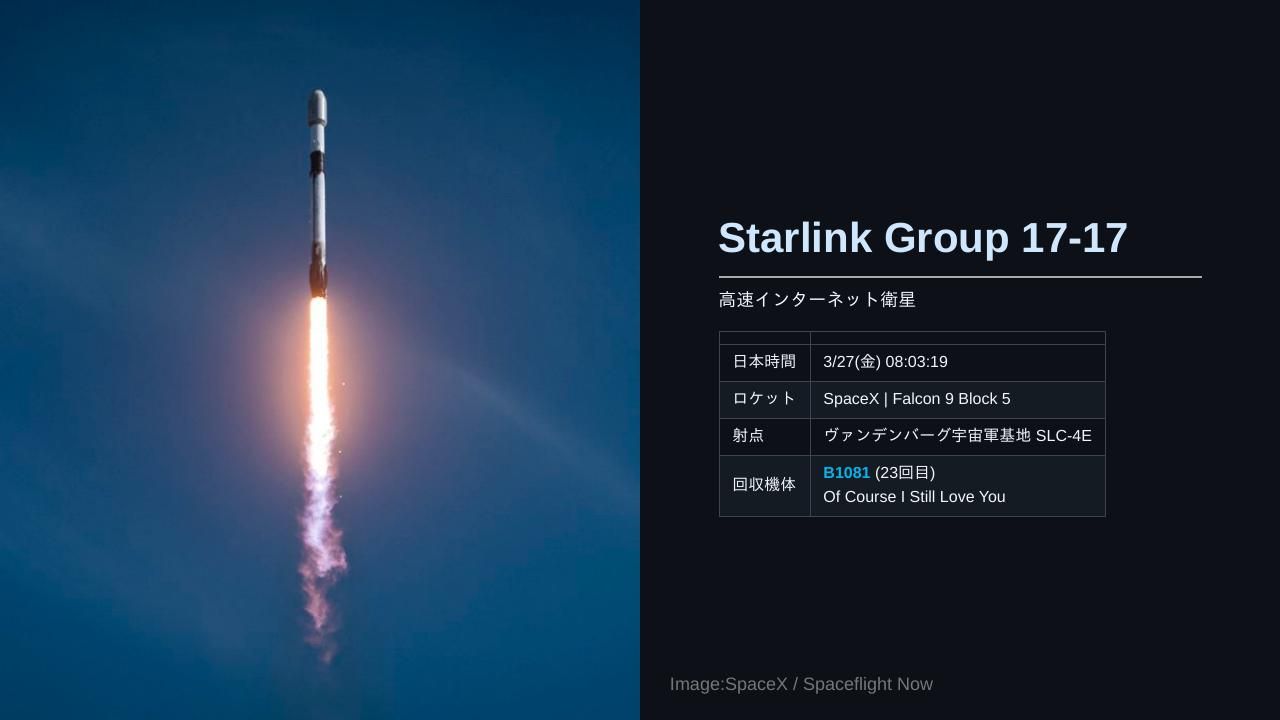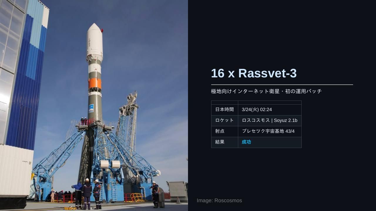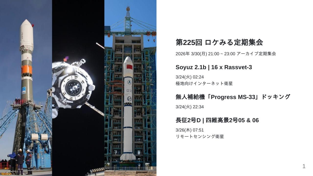 | ミッション | 日本時間 3/24(火) 02:24 Soyuz 2.1b | 16 x Rassvet-3日本時間 3/24(火) 22:00 Ignition: NASA's Plan for The Moon日本時間 3/24(火) 22:34 無人補給機「Progress MS-33」ドッキング日本時間 3/25(水) 02:00 Ignition: NASA's Plan for Science and Discovery日本時間 3/25(水) 05:45 Ignition: NASA News Conference日本時間 3/26(木) 07:51 長征2号D | 四維高景2号05 & 06日本時間 3/27(金) 08:03:19 Falcon 9 Block 5 | Starlink Group 17-17日本時間 3/27(金) 13:11 長征2号C/YZ-1S | 試験33号日本時間 3/28(土) 18:14 Electron | Daughter Of The Stars (LEO-PNT Pathfinder A)日本時間 3/30(月) 00:30 Artemis II Crew Q&A from Quarantine日本時間 3/30(月) 03:00 Artemis II L-3 Countdown Status News Conference日本時間 3/29(日) 以降 RV-X Flight test日本時間 3/30(月) 20:00 力箭2号 | 軽舟試作機日本時間 3/30(月) 20:02:00 Falcon 9 Block 5 | Transporter 16 (Dedicated SSO Rideshare) |