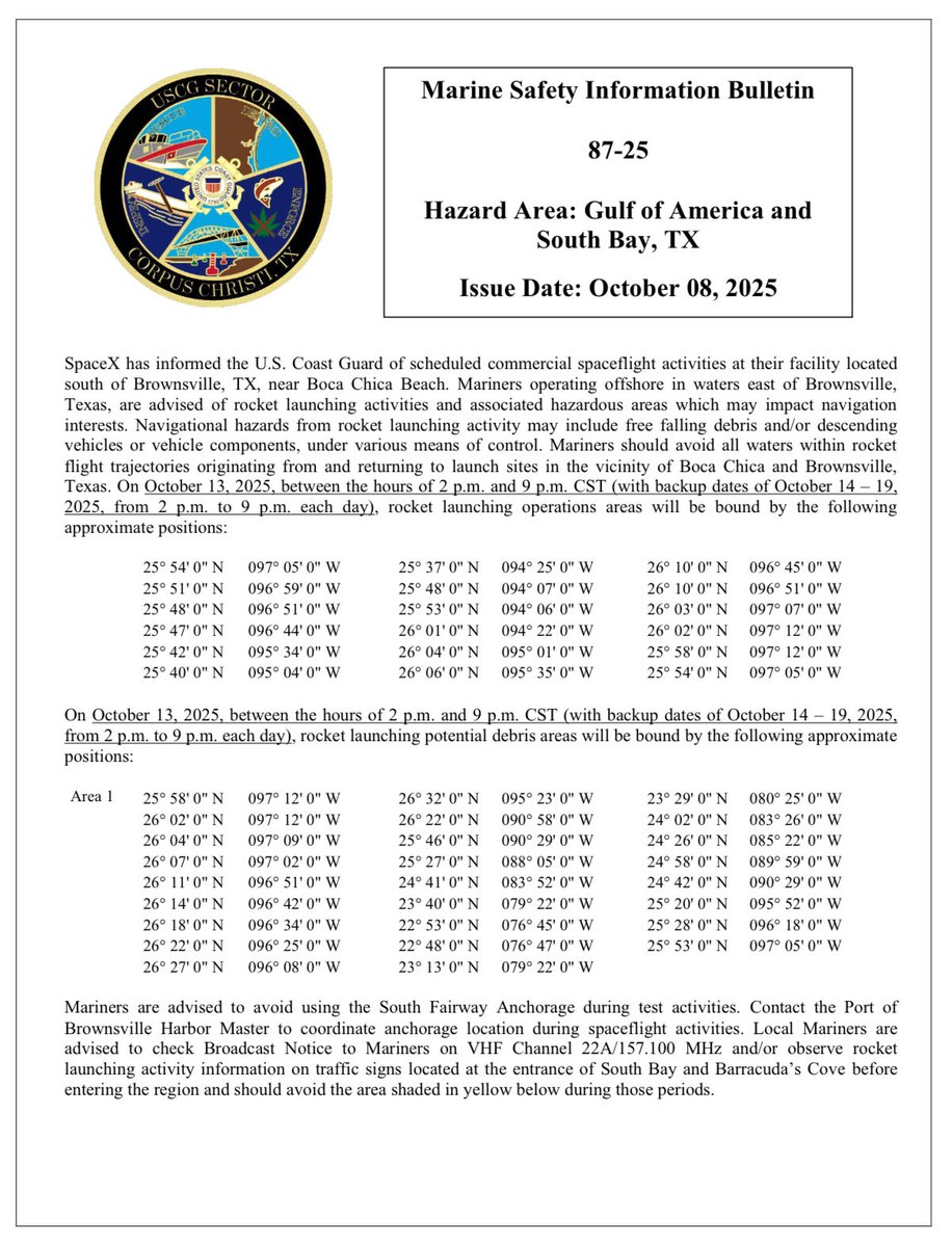 SpaceXは、Starshipの11回目の統合飛行試験を10月13日午後6時15分(米国中部時間)にテキサス州スターベースから実施する予定です。FAAは飛行に伴う空域・海域の閉鎖を通達(NOTAM)しました。今回のミッションではBooster 15-2とShip 38が使用され、ブースターは回収せずメキシコ湾への着水を試みます。Ship 38は改良された耐熱システムを備え、スターリンクv3の模擬衛星8基を搭載して準軌道飛行を行います。打ち上げに向け、ブースターが発射台へ設置されるなど、準備が着々と進められています。