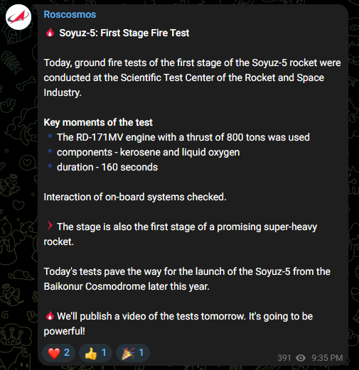 ロシアの国営宇宙企業ロスコスモスは、開発中の新型ロケット「ソユーズ5」の第一段の静的燃焼試験を実施した。この試験では、推力800トンのRD-171MVエンジンが使用され、ケロシンと液体酸素を燃料として160秒間燃焼した。試験の成功は、今年後半に予定されているバイコヌール宇宙基地からの初打ち上げに向けた重要な一歩となる。