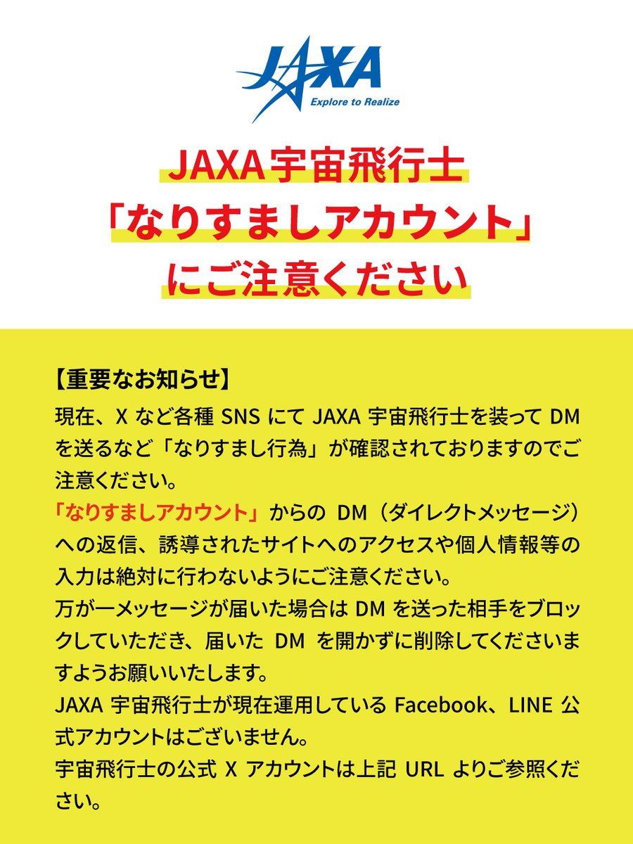 JAXAは、同機関の宇宙飛行士を装ったソーシャルメディアのなりすましアカウントから、ダイレクトメッセージ(DM)が送られる事例が確認されたとして注意を呼びかけています。JAXAは、不審なDMには返信せず、個人情報などを入力しないよう警告しており、公式アカウント以外からの連絡には注意が必要です。